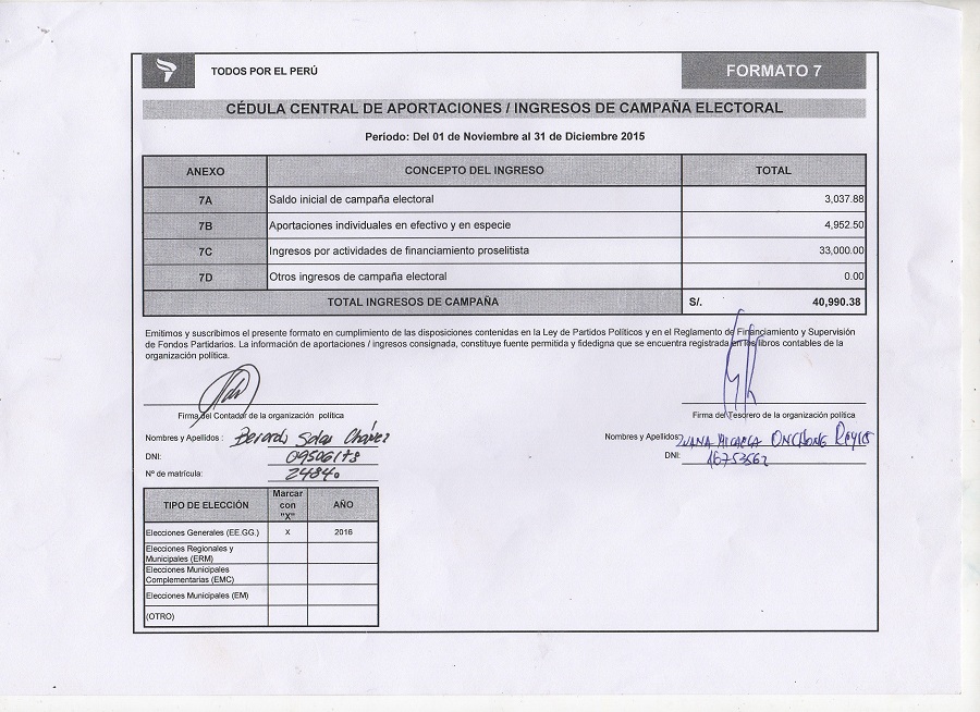 En tanto, los gastos de campaña de Todos por el Perú suma un monto de 33, 947 nuevos soles desde el 01 de noviembre al 31 de diciembre del 2015. Guzmán Cáceres indicó que el informe detallado será entregado este lunes a la Oficina Nacional de Procesos Electorales.