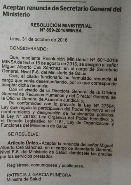 De acuerdo a la Resolución Ministerial N° 859-2016/MINSA, publicada hoy en el Diario Oficial El Peruano, se acepta la renuncia de Celi Sánchez. El documento lleva la firma de la Ministra de Salud, Patricia García Funegra.