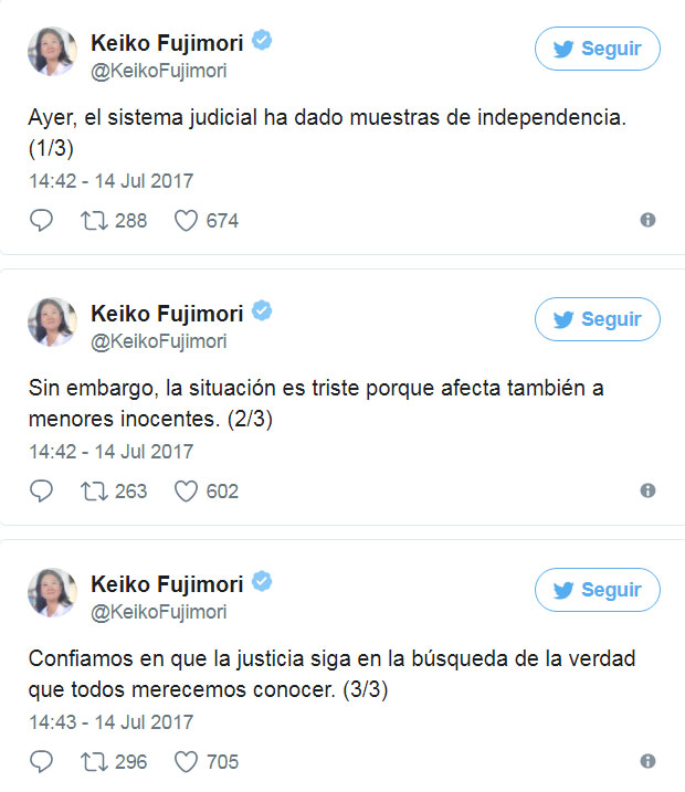“Ayer, el sistema judicial ha dado muestras de independencia. Sin embargo, la situación es triste porque afecta también a menores inocentes”, fue uno de los mensajes en Twitter de la lideresa de Fuerza Popular.