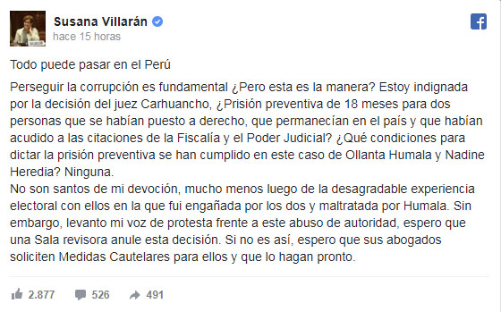 “Perseguir la corrupción es fundamental ¿Pero esta es la manera? Estoy indignada por la decisión del juez Carhuancho, ¿Prisión preventiva de 18 meses para dos personas que se habían puesto a derecho, que permanecían en el país y que habían acudido a las citaciones de la Fiscalía y el Poder Judicial?rdquo;, escribió.