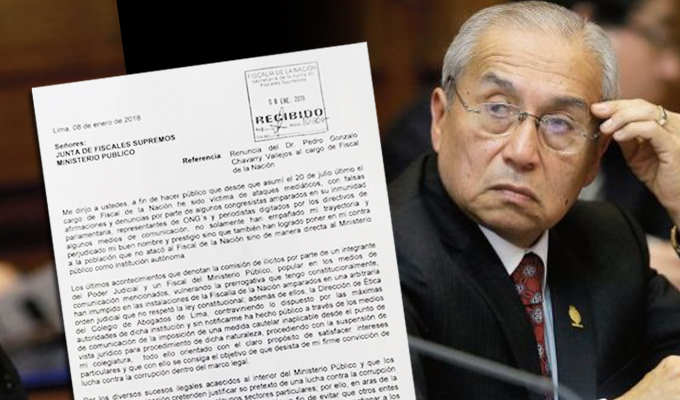 Pedro Chávarry formalizó su renuncia esta mañana ante la Junta de Fiscales Suprema del Ministerio Público. Según el saliente magistrado, tomó la decisión por respeto a mi institución, el amor a Dios y a mi familia".