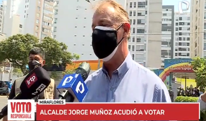 El alcalde de Lima, Jorge Muñoz, acudió esta tarde al centro educativo Elizabeth Espejo, en el distrito de Miraflores, para emitir su voto y se refirió sobre el próximo representante que será elegido en las elecciones 2021.