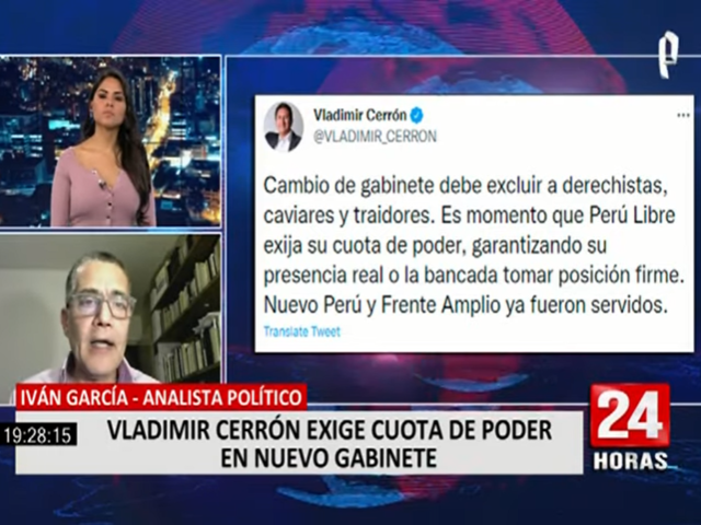 El periodista y analista políticoIván García indicó que existe una postura de oposición por parte del secretario general del partido Perú Libre, Vladimir Cerrón, que ya viene anunciando a través de sus tuits y declaraciones.