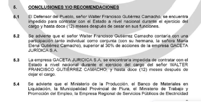 “El defensor del pueblo, señor Walter Francisco Gutiérrez Camacho, se encuentra impedido para contratar con el Estado a nivel nacional durante el ejercicio del cargo y hasta doce meses después de cesar en sus funciones”, se lee en el dictamen emitido por OSCE al que accedió el periodista Daniel Yovera.