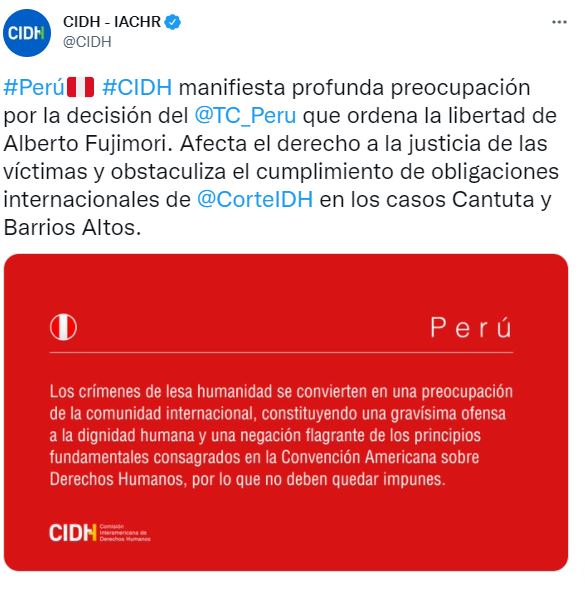 “CIDH manifiesta profunda preocupación por la decisión del Tribunal Constitucional que ordena la libertad de Alberto Fujimori. Afecta el derecho a la justicia de las víctimas y obstaculiza el cumplimiento de obligaciones internacionales de la Corte IDH en los casos Cantuta y Barrios Altos”, se lee en un tuit.