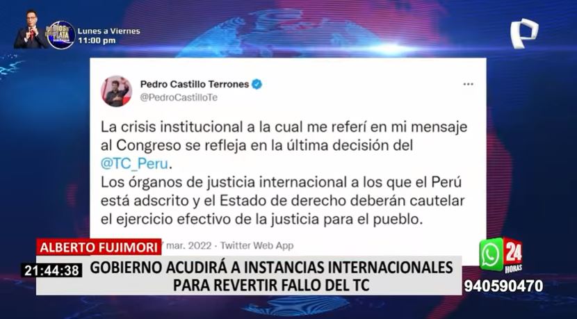“Expresamos nuestra preocupación por la decisión del TC que otorga un habeas corpus a favor de Alberto Fujimori, autor de graves crímenes que dañaron al Perú. Nos solidarizamos con las víctimas de los casos Barrios Altos y La Cantuta afectadas con esa decisión”, señaló Boluarte.