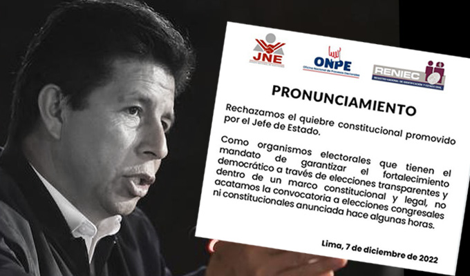 Mediante un comunicado el Jurado Nacional de Elecciones, junto a la Oficina Nacional de Procesos Electorales conocida por sus siglas ONPE y la Registro Nacional de Identificación y Estado Civil – RENIEC, se pronunciaron ante la decisión del mandatario Pedro Castillo Terrones de aprobar la disolución temporal del Congreso de la República y declarar estado de excepción en todo el Perú por 90 días.