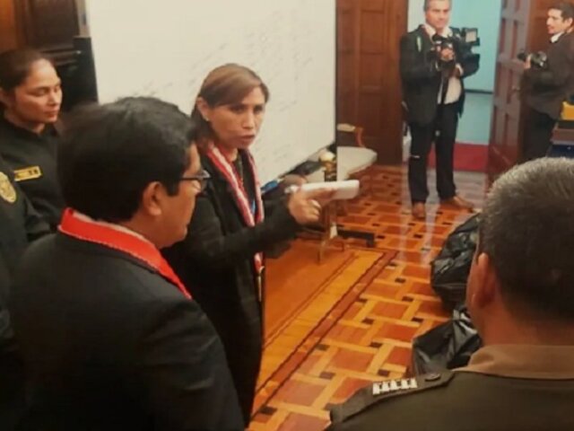 La fiscal de la Nación, Patricia Benavides, acompañada del fiscal adjunto supremo Marco Huamán, dirige la diligencia que se realiza en el recinto presidencial, donde se están interviniendo documentos y algunos equipos de cómputo, como parte de la investigación.