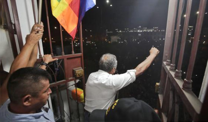 Luego de finalizar la conferencia de prensa, salió a dar un balconazo, pero sus palabras no fueron bien recibidas por los participantes a la marcha a favor del cierre del Congreso, quienes le lanzaron diversos objetos, informa Correo.