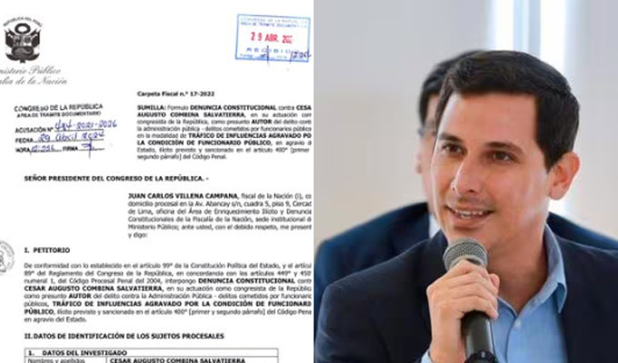 El titular del Ministerio Público, Juan Carlos Villena, presentó una denuncia constitucional contra el excongresista César Combina - elegido por Alianza para el Progreso (APP) para el periodo complementario 2020-2021- por el presunto delito de tráfico de influencias agravado.