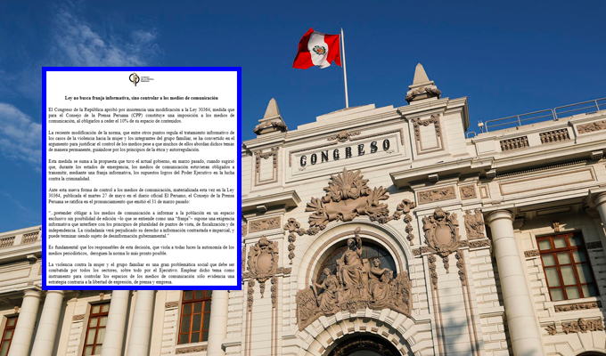 La reforma a la Ley 30364, publicada el 27 de mayo en El Peruano, pretende presentarse como una herramienta para sensibilizar sobre una problemática urgente. Sin embargo, el CPP denunció que “pretender obligar a los medios de comunicación a informar a la población en un espacio exclusivo sin posibilidad de edición… interfiere con los principios de pluralidad de puntos de vista, de fiscalización y de independencia”. La preocupación gira en torno a la utilización del combate a la violencia como argumento para establecer mecanismos de control estatal sobre la prensa.