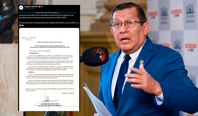 El presidente del Congreso de la República, Eduardo Salhuana Cavides, oficializó este miércoles la convocatoria para la elección de la nueva Mesa Directiva correspondiente al Período Anual de Sesiones 2025-2026. La votación se llevará a cabo el sábado 26 de julio a las 10:00 a. m., según lo establecido en el Decreto de Presidencia N.° 001-2024-2025-P-CR.