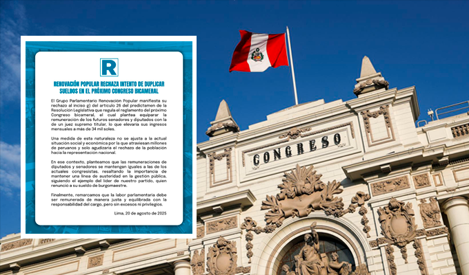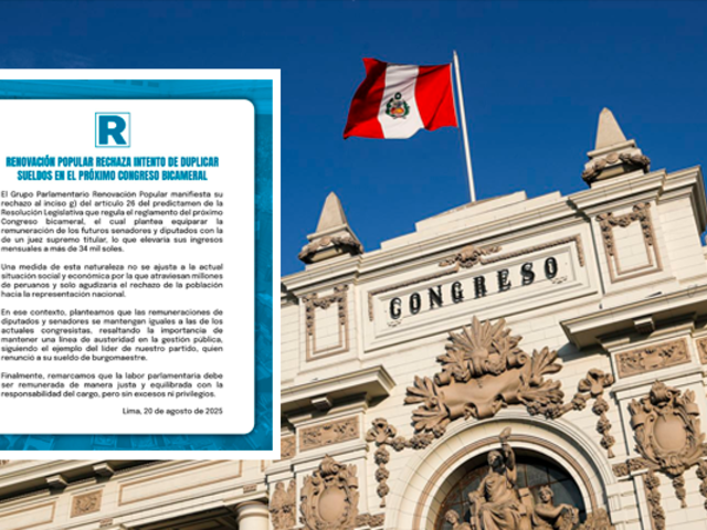 Horas después, la bancada publicó un comunicado en el que expresó: “El Grupo Parlamentario Renovación Popular manifiesta su rechazo al inciso g) del artículo 26 del predictamen de la Resolución Legislativa que regula el reglamento del próximo Congreso bicameral”. El texto añade que esta disposición “plantea equiparar la remuneración de los futuros senadores y diputados con la de un juez supremo titular, lo que elevaría sus ingresos mensuales a más de 34 mil soles”.
