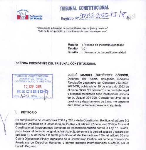 El defensor del pueblo, Josué Gutiérrez, presentó ante el Tribunal Constitucional una demanda de inconstitucionalidad contra la Ley Nº 32419, publicada el 31 de diciembre de 2024. La norma cuestionada otorga amnistía a miembros de las Fuerzas Armadas, la Policía Nacional del Perú y los Comités de Autodefensa que participaron en la lucha contra el terrorismo entre 1980 y 2000.
