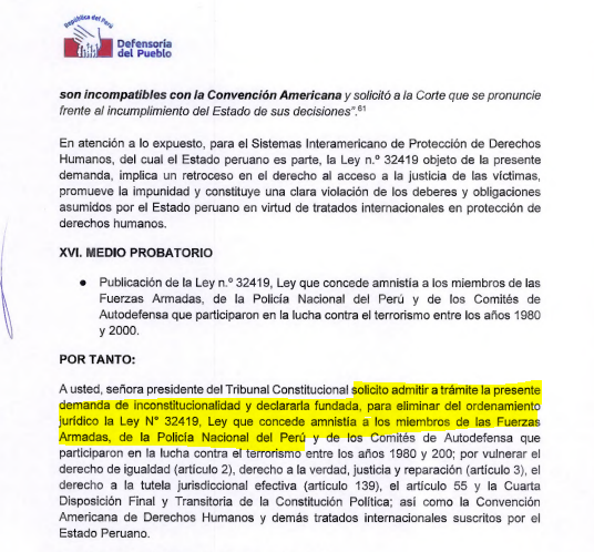 En su petitorio, el defensor del pueblo solicita al Tribunal Constitucional admitir a trámite la demanda y, tras el proceso correspondiente, declarar la inconstitucionalidad de la norma. El recurso enfatiza que el respeto a la vida, la justicia, la reparación y la tutela judicial efectiva son pilares que el Estado no puede desconocer bajo el pretexto de medidas de amnistía.