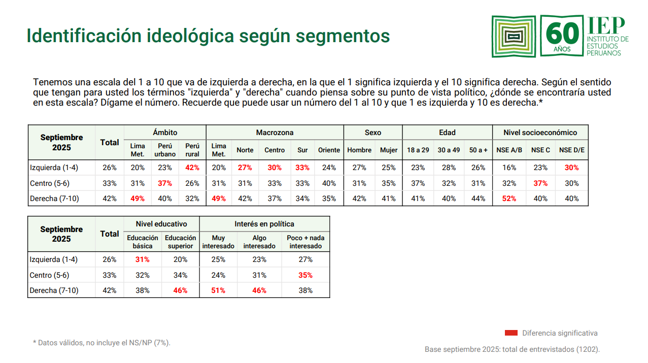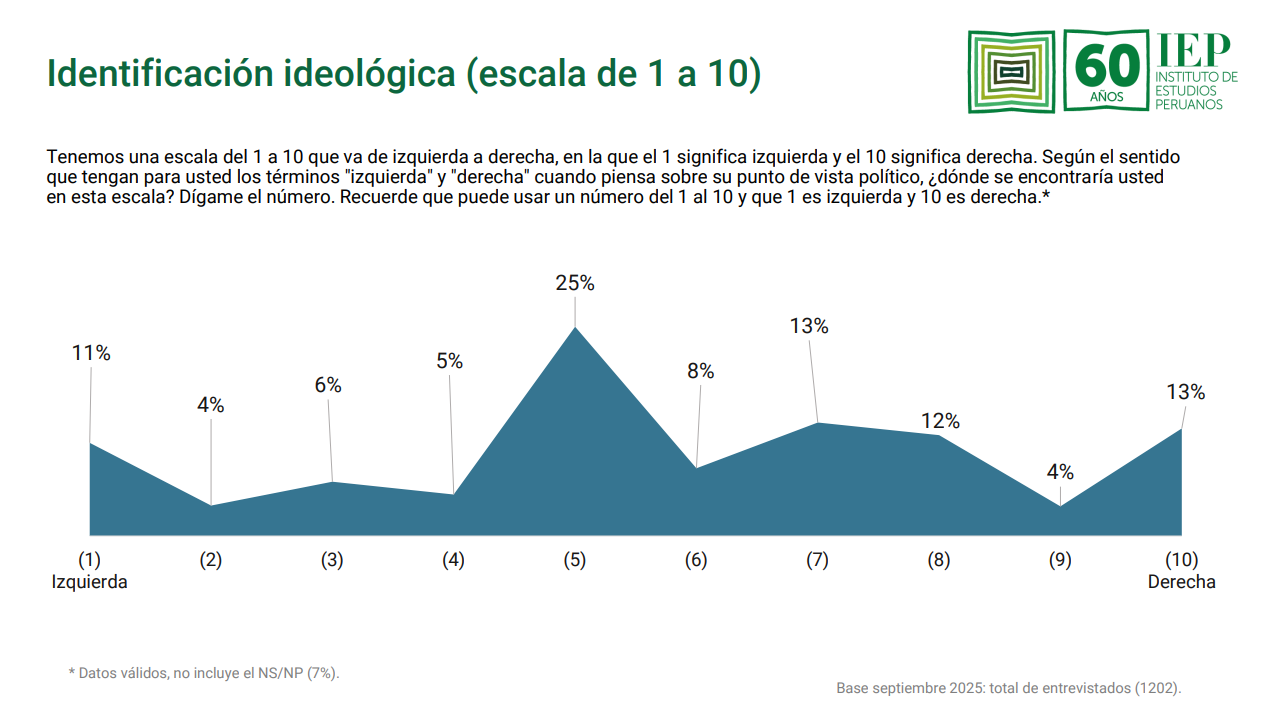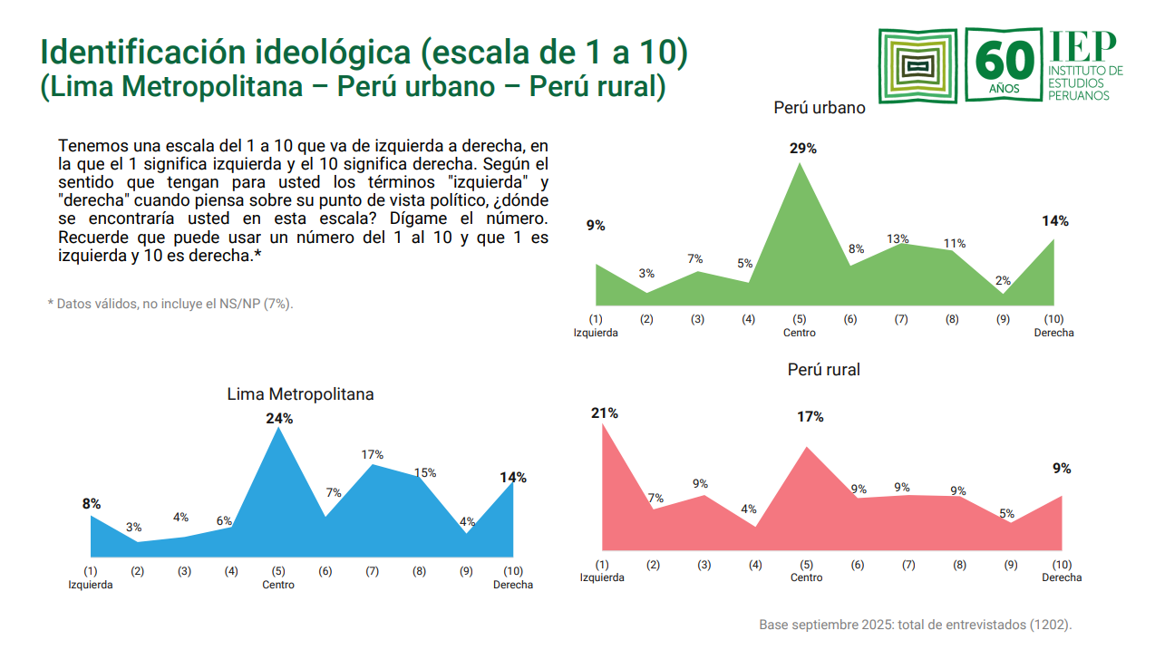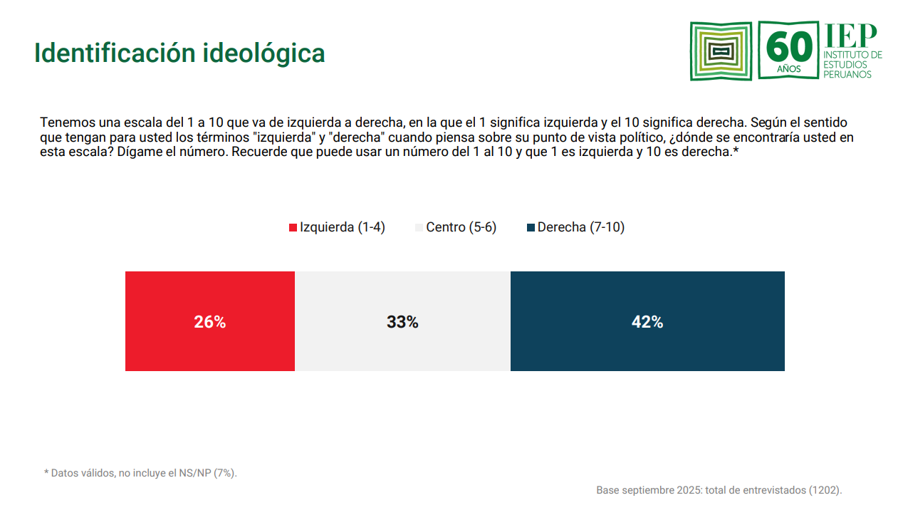 De acuerdo con el Instituto de Estudios Peruanos (IEP), “el 42% de entrevistados se identificó con posiciones de derecha (niveles 7 a 10), un 26% se ubicó en la izquierda (1 a 4) y un 33% se consideró de centro (5 y 6)”. La medición fue realizada en septiembre de 2025 y confirma que, en el escenario político nacional, la mayoría se concentra hacia la derecha o en posiciones intermedias.