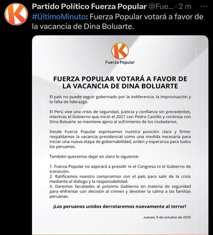 El vocero de Fuerza Popular, César Revilla, informó que su bancada parlamentaria respaldará cualquier moción de vacancia presidencial que se impulse en el Congreso de la República contra la mandataria Dina Boluarte.