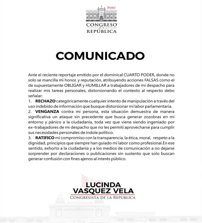 Por fin se pronunció. Tras el informe televisivo que mostrara imágenes donde un asesor le cortaba las uñas de los pies, la congresista Lucinda Vásquez emitió un comunicado negando los hechos y asegurando ser víctima de un ataque planificado.