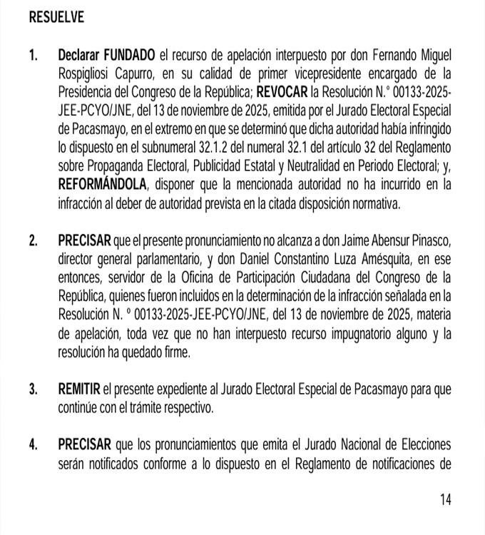 El Jurado Nacional de Elecciones (JNE) declaró fundada la apelación del titular del Congreso, Fernando Rospigliosi Capurro, y revocó la resolución que lo sancionaba por el uso de una cámara del Legislativo en un evento del partido Fuerza Popular.