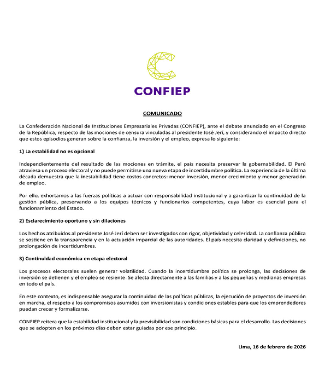 El documento fue difundido ante el debate que se realizará hoy en el Congreso de las mociones de censura contra el presidente José Jerí, y ante el impacto que situaciones como estas generan sobre la confianza, la inversión y el empleo.