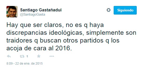 “Hay que ser claros, no es que haya discrepancias ideológicas, simplemente son traidores que buscan otros partidos que los acoja de cara al 2016”, también escribió, en clara alusión a lo declarado por Tejada.