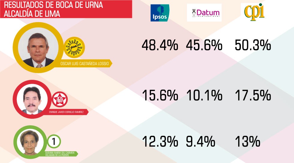 El primer Flash Electoral a boca de urna, según Ipsos, coloca al candidato Luis Castañeda Lossio en el primer lugar con 48.4%, seguido por Enrique Cornejo con 15.6% y en el tercer lugar a Susana Villarán con 12.3%. El candidato Salvador Heresi obtuvo un 6.5%.