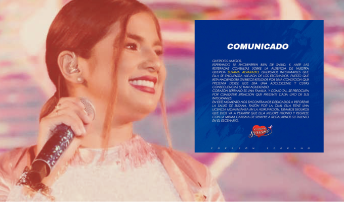 “En este momento nos encontramos dedicados a reforzar la salud de Susana, razón por la cual ella tiene licencia momentánea en la agrupación. Estamos seguros que Dios va a permitir que ella mejore pronto y regrese con el mismo carisma de siempre al regalarnos su talento en el escenario", se lee en el mensaje.