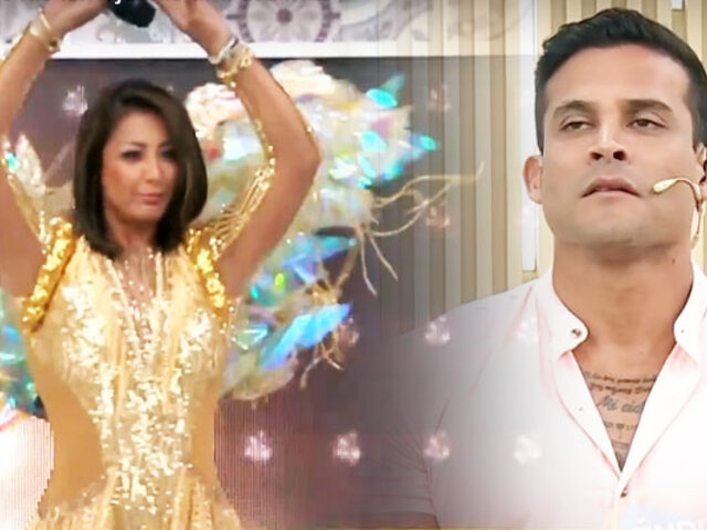 Apareció despampanante con lentejuelas doradas y plumas tornasoladas sorprendiendo a todos, en especial a su compañero de condición, Christian Domínguez, que no dudó de llenarla de halagos, destacando lo tonificado de su anatomía.