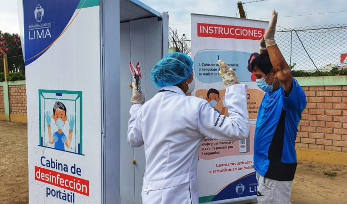 La primera cabina de desinfección portátil fue instalada por la Municipalidad Metropolitana de Lima en el ingreso del mercado mayorista móvil de San Juan de Miraflores, con el fin de prevenir el contagio del coronavirus. La medida, rápida y eficiente, busca proteger a los ciudadanos, dijeron.
