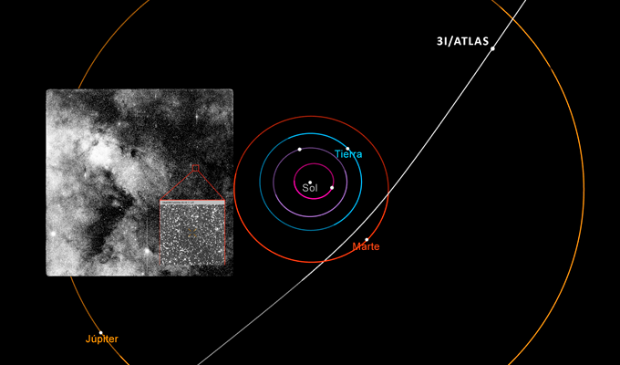 El cometa proviene de una dirección cercana a la constelación de Sagitario, que coincide con la región central de la Vía Láctea. Según la agencia espacial, “3I/ATLAS se formó en otro sistema estelar y de alguna manera fue expulsado al espacio interestelar”. Durante millones —o incluso miles de millones— de años ha viajado hasta llegar a nuestras cercanías cósmicas.