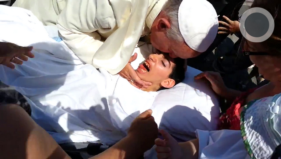 El Sumo Pontífice volvió a sorprender con sus conmovedores gestos. Esta vez, no dudó en detener la caravana que lo transportaba al sur de Italia para saludar a un joven discapacitado quien se encontraba postrado en camilla. Los que se encontraban en el lugar se emocionaron hasta las lágrimas ante esta actitud del Papa Francisco, quien besó y bendijo al discapacitado.