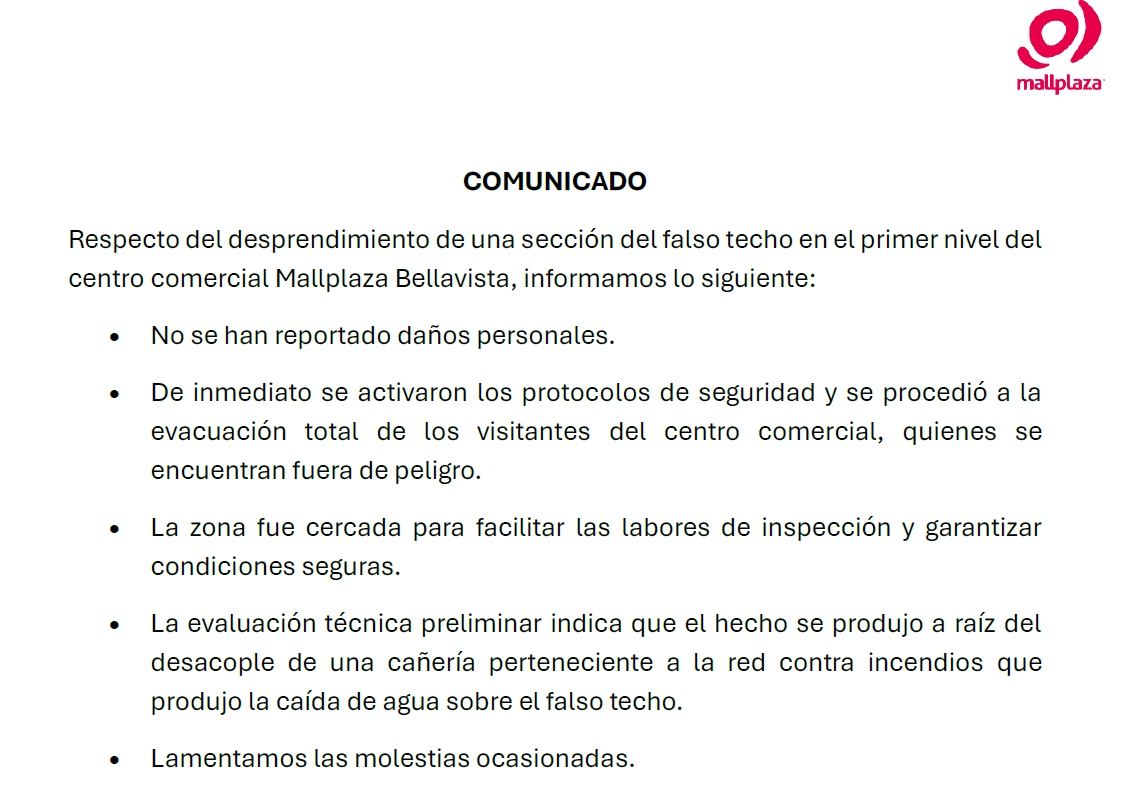 Tras el desprendimiento de una parte del falso techo en el primer nivel del Mallplaza Bellavista, se informó mediante un comunicado que no hubo personas heridas y que se activaron de inmediato los protocolos de evacuación.